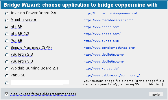 In the first actual step of the wizard "choose application to bridge coppermine with", you have to choose the application you actually want to coppermine with. Note that you must have this application already installed on your webserver, it has to be properly configured and must be up-and-running. Don't use the bridge manager yet if you only plan to integrate coppermine with another application later.