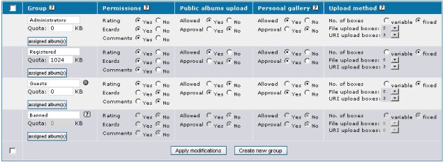 2.1.3 What the installer doesAfter performing some basic checks, the installer creates the needed database tables for you and fills them with default values. It creates the file include/config.inc.php within the coppermine folder on your server that stores the database details you entered during install. If you should change your mysql database details later (i.e. if you change the password of your mysql user account or if you migrate your gallery to another server), you will need to edit include/config.inc.php manually to reflect the changes. The file include/config.inc.php also keeps the install script from being run twice: if the installer is run, a check is performed wether the config file exists - if yes, the installer will stop and redirect the user to the index page. 2.2 Getting startedUse the "Album Manager" ("Albums" link in the admin menu) in to create and order your albums. You'll need at least one album your files can go into. Use the anonymous group to define what non-registered users can and can't do (in the groups panel). Use the properties of an album to modify its description and permissions. In order for a user to be allowed to upload a file in album two conditions must be met: